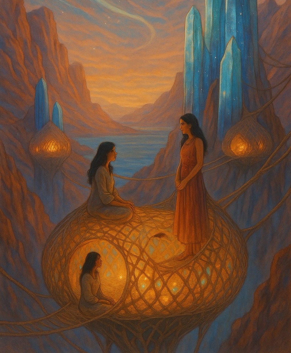 Ambas eran soñadoras conscientes, cuidando estanques de montaña que no reflejaban agua —sino líneas temporales. Cada una ayudaba a preparar a los iniciados para el viaje del alma a través de las puertas oníricas.