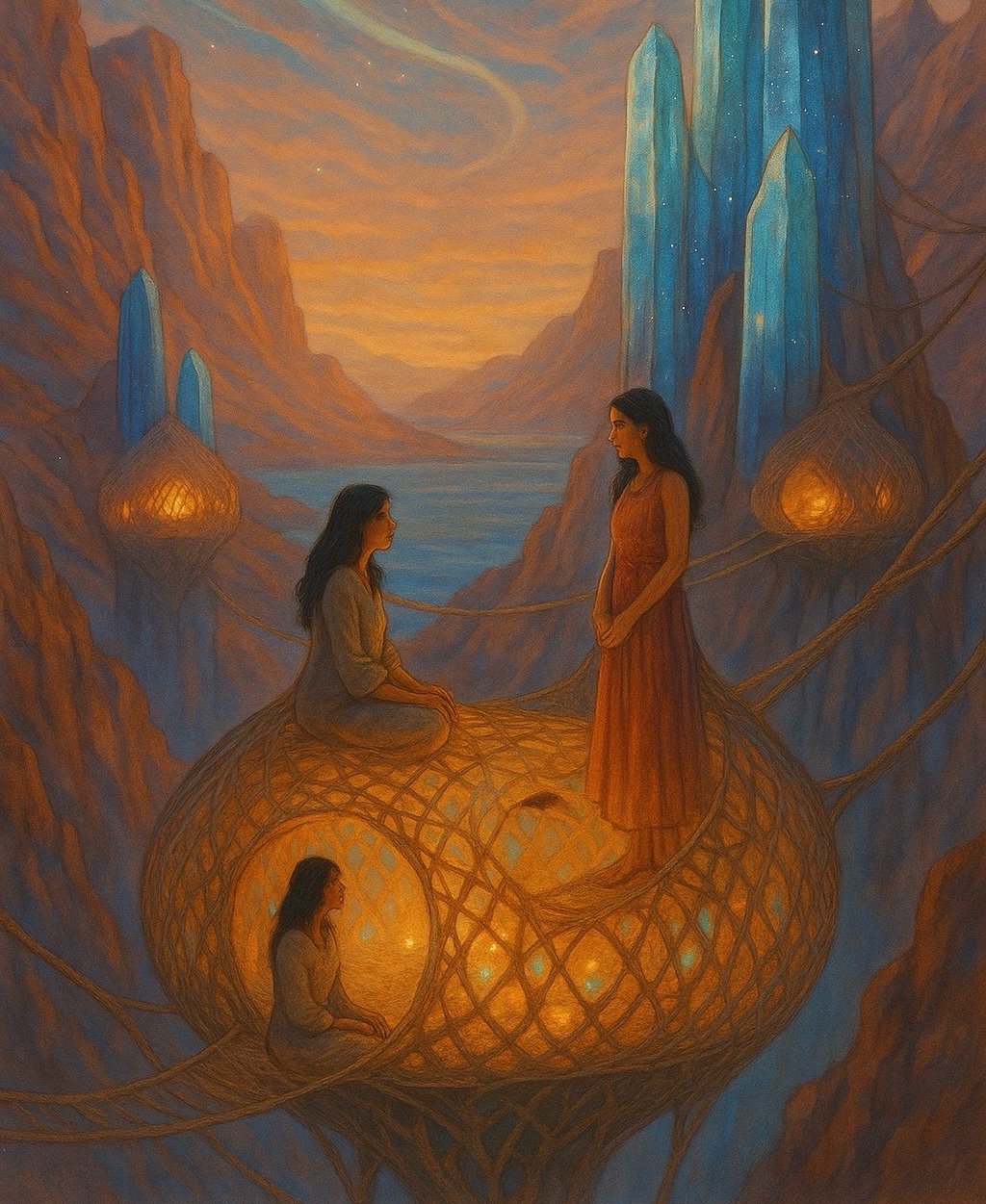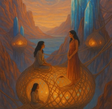 You were both members of a tonal weaving guild—You would gather sonic filaments from the upper atmosphere and braid them into fields of healing. Isabel focused on womb-tones and gestational harmonics, while you translated celestial winds into directional guidance for star-vessels.