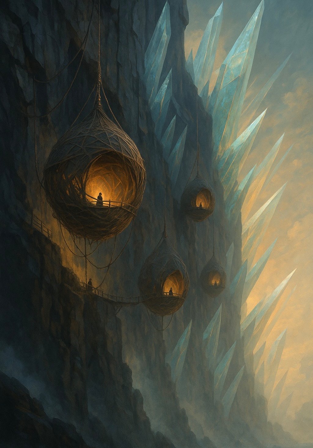 Can you please create a 7” x 10” illustration of “You lived in hanging dwellings, like nests suspended between cliff-crystals”.